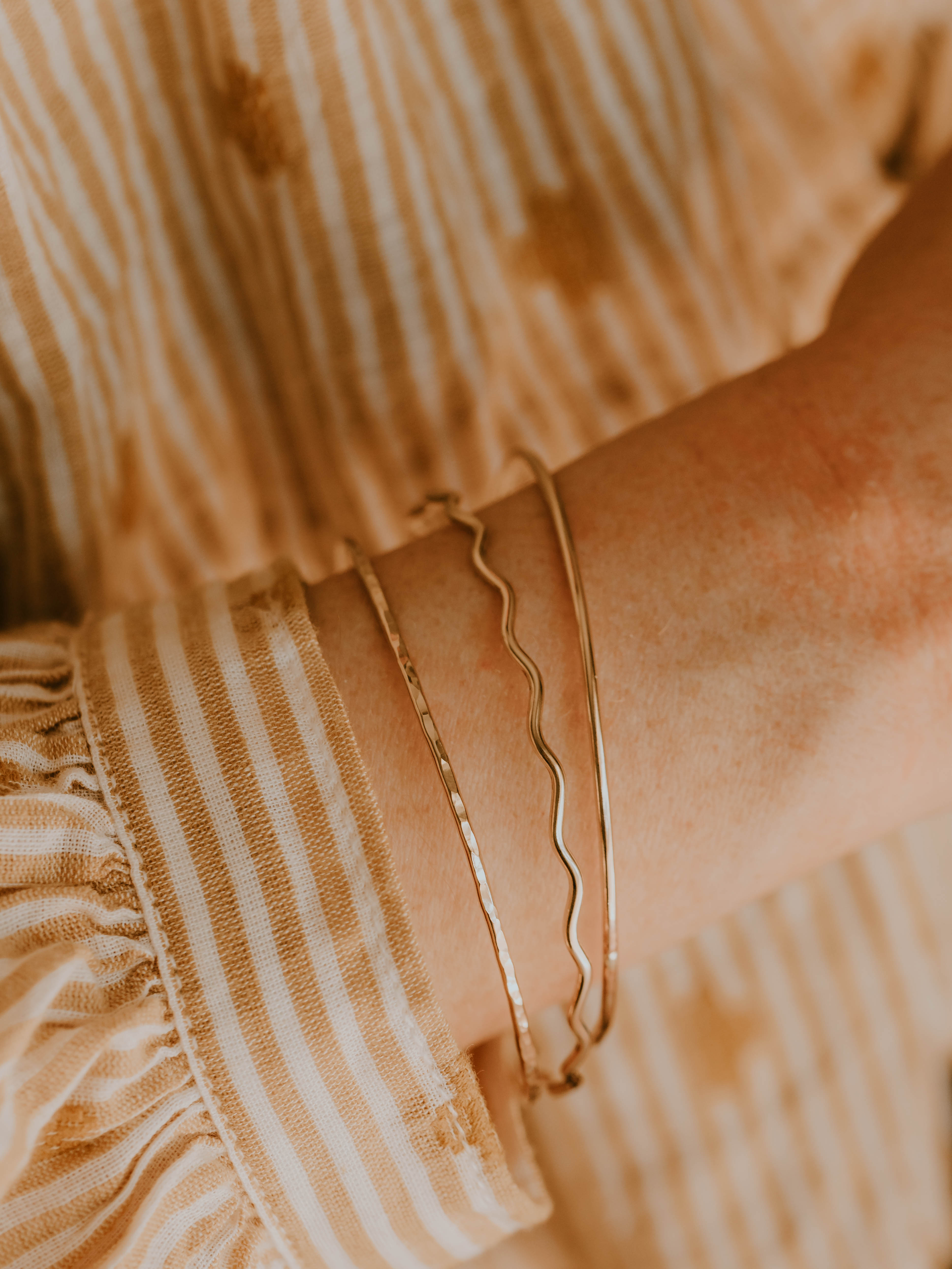 • Simply slide the bangle over your hand (one at a time if wearing a stack, you should not try to put 3 or 5 on at a time, it can misshape them), there should be a little resistance when sliding it over your knuckles, but not put on forcefully where it hurts!
